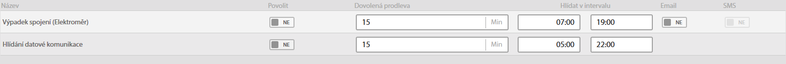 Zde nastavujete prodlevu mezi vznikem alarmu a jeho hlášením. Tato prodleva zamezuje odeslání mnoha alarmových hlášení, kdy se osvit pohybuje těsně nad a pod mezní hodnotou, nastavenou v parametrech nastavení dohledu (výše na stránce).