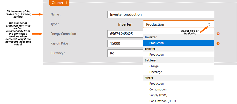 If you enter incorrect number of pulses, Solar Monitor will be unable to present correct information about the power production. If the counter does't read the pulses, please check electrometer's cables and connection polarity.
