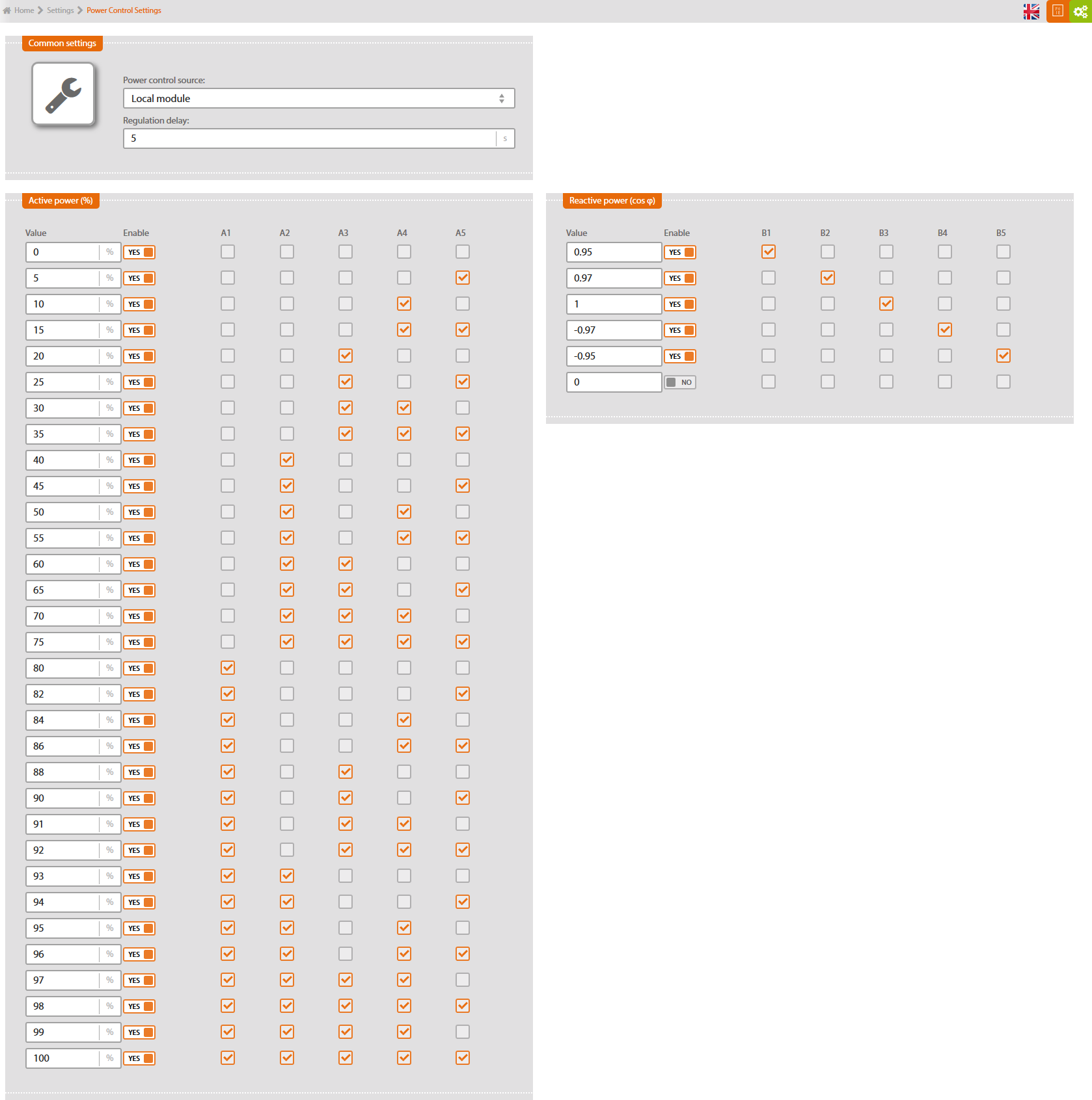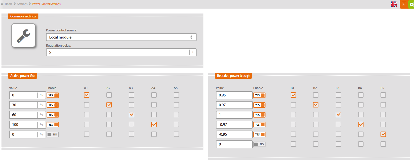 As soon as the modules are connected and Solar Monitor unit is connected to the power supply, a green LED diode indicating status should glow. In case it doesn't glow, check if module is connected to SM2-MU. Open menu „System set up / Power control“ in you browser. You have to set up inputs combinations and relevant power control values in % or cos φ here.