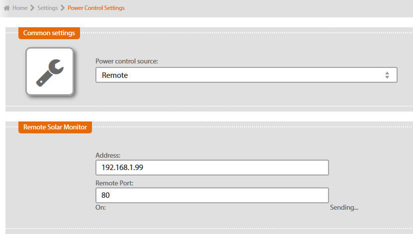 If you wish to use PC module for more Solar Monitor units, select option „Remote“ in menu „Power control source“ for each unit. Fill in the address of SM2-MU, where the power control module is connected. .