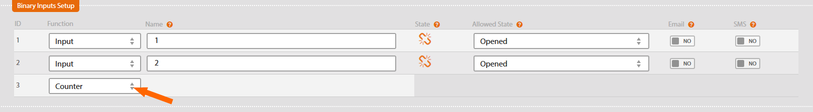 For input with a connected meter select option Counter in table Inputs and Counters. Meter can be connected to all 3 inputs. You can connect up to 3 meters to SM2-MU.