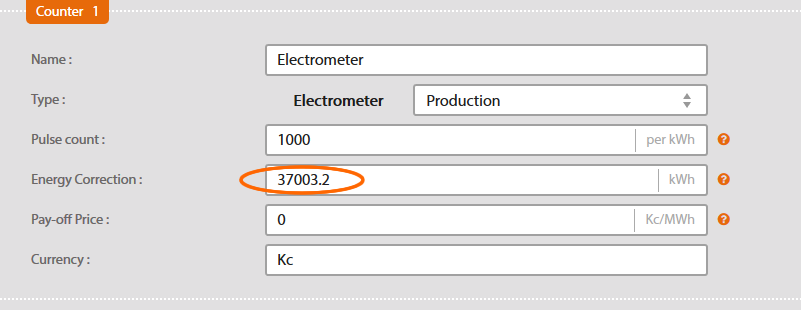 In upper part of the table there is name of the counter. Enter its name (e.g. electro meter) and select its type. Set up correct number of pulses per 1 kWh (as stated in SO output parameters at the counter).