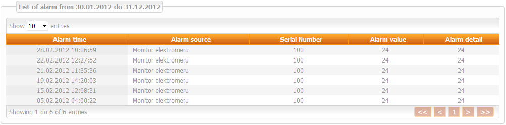 Recorded alarms can be presented for daily, monthly or annual period. Time period stipulates the day (days) of presented alarms.