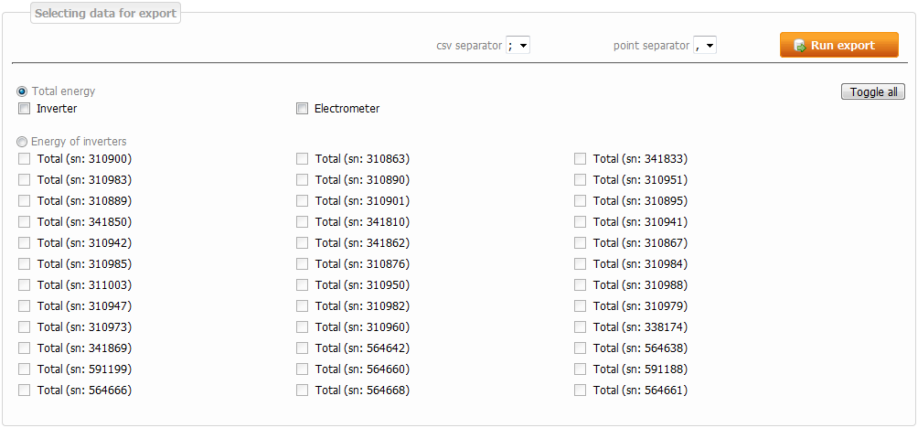Select a Solar Monitor unit (units) for exporting total energy production data.