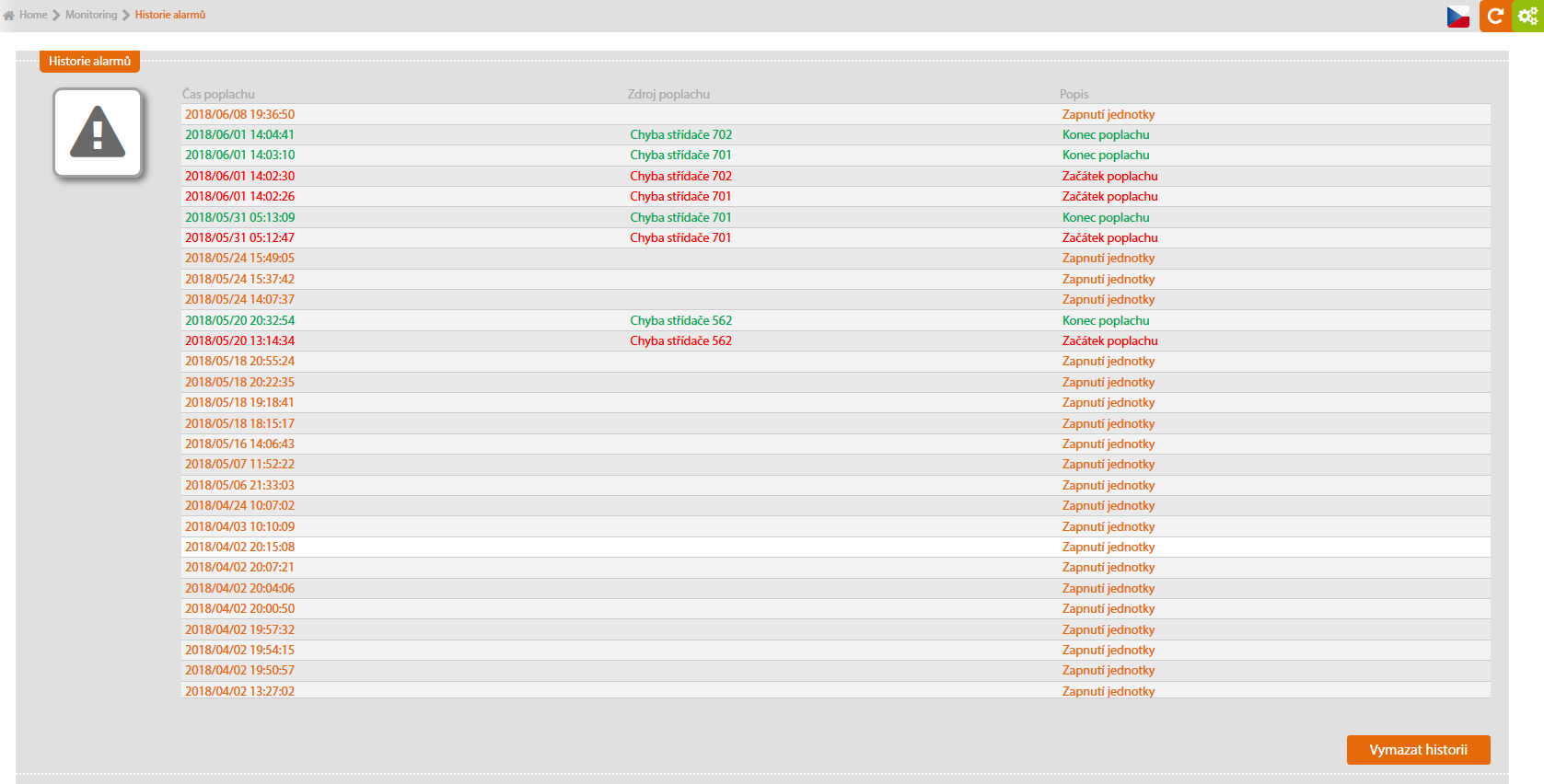Do tabulky jsou chronologicky zapisovány počátky a konce vzniklých alarmů. Historii lze vymazat tlačítkem v pravém dolním rohu.