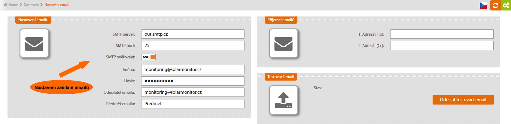 Zadejte adresy příjemců emailů. Funkčnost lze ověřit tlačítkem. Pokud email nepřijde, zkontrolujte nastavení SMTP (sekce „Nastavení emailu“).