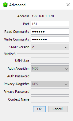 Vyplňte pole Read Community a Write Community dle nastavení v Solar Monitoru (defaultně public, private). Klikněte na OK.