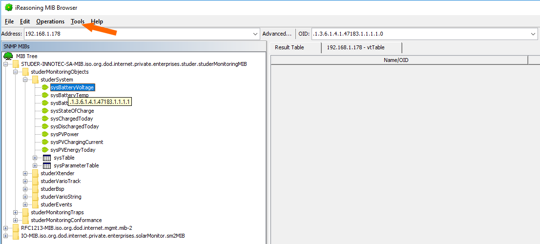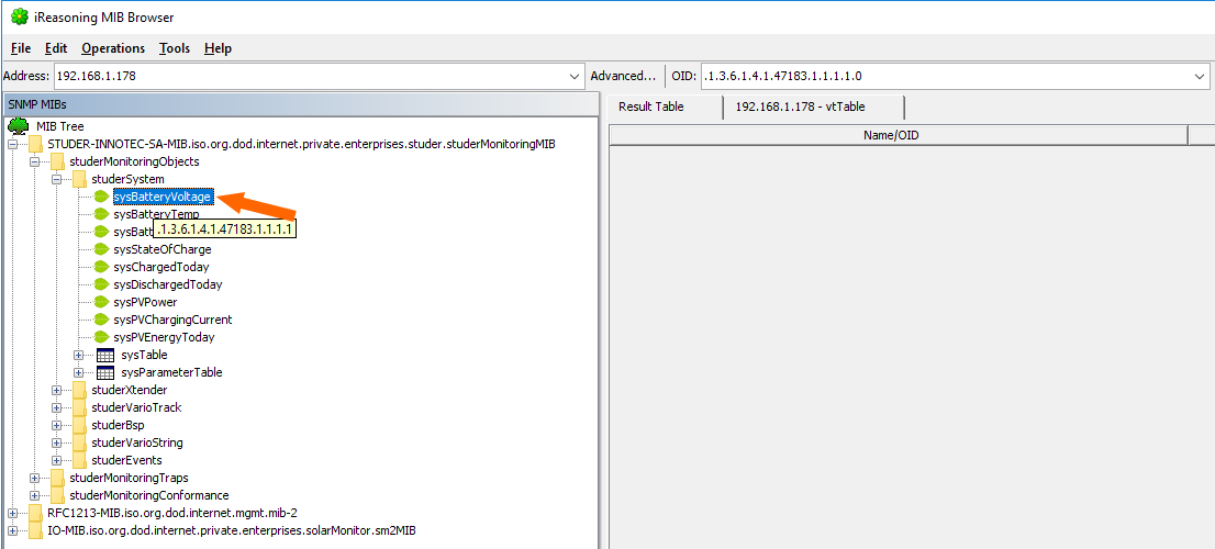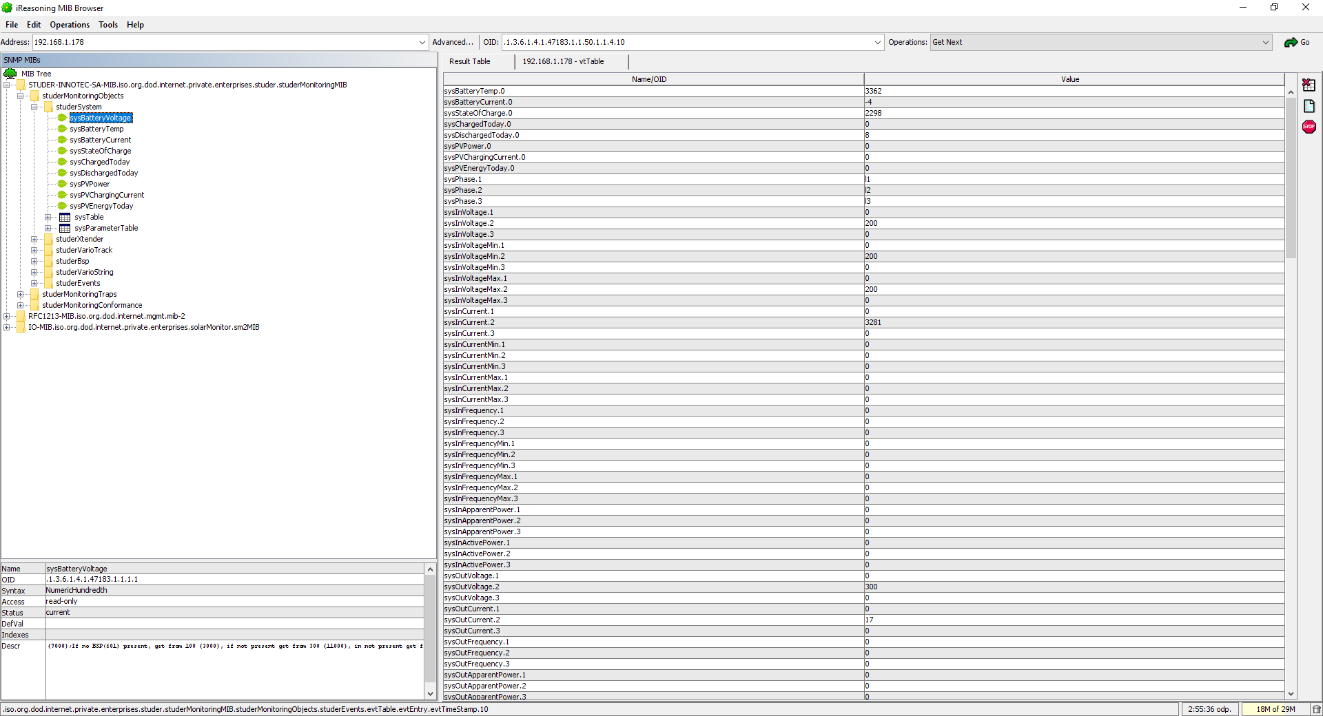 Vyberte si ve stromové stuktuře MIB databáze proměnnou, kterou chcete vyčíst a zobrazit v tabulce a klikněte na ni levým tlačítkem myši. V dolní levé části se zobrazí její popis a OID identifikátor) .