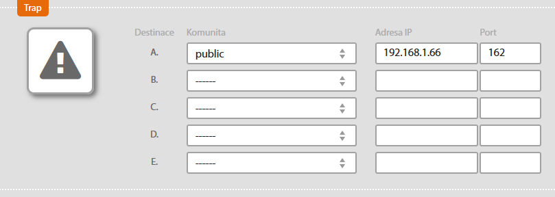 Zvolte komunitu, do pole Adresa IP zadejte IP adresu PC, ve kterém běží iReasoning MIB Browser, port 162 na straně serveru pro trapy.