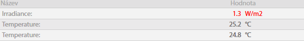V tomto poli jsou vypsány všechny nalezené senzory a jejich aktuální hodnoty. Čtení senzorů se provádí každou vteřinu. Senzory je možno libovolně pojmenovat a nastavit jejich povolené hodnoty v menu Nastavení systému/Senzory a alarmy, viz kapitola Senzory a alarmy.