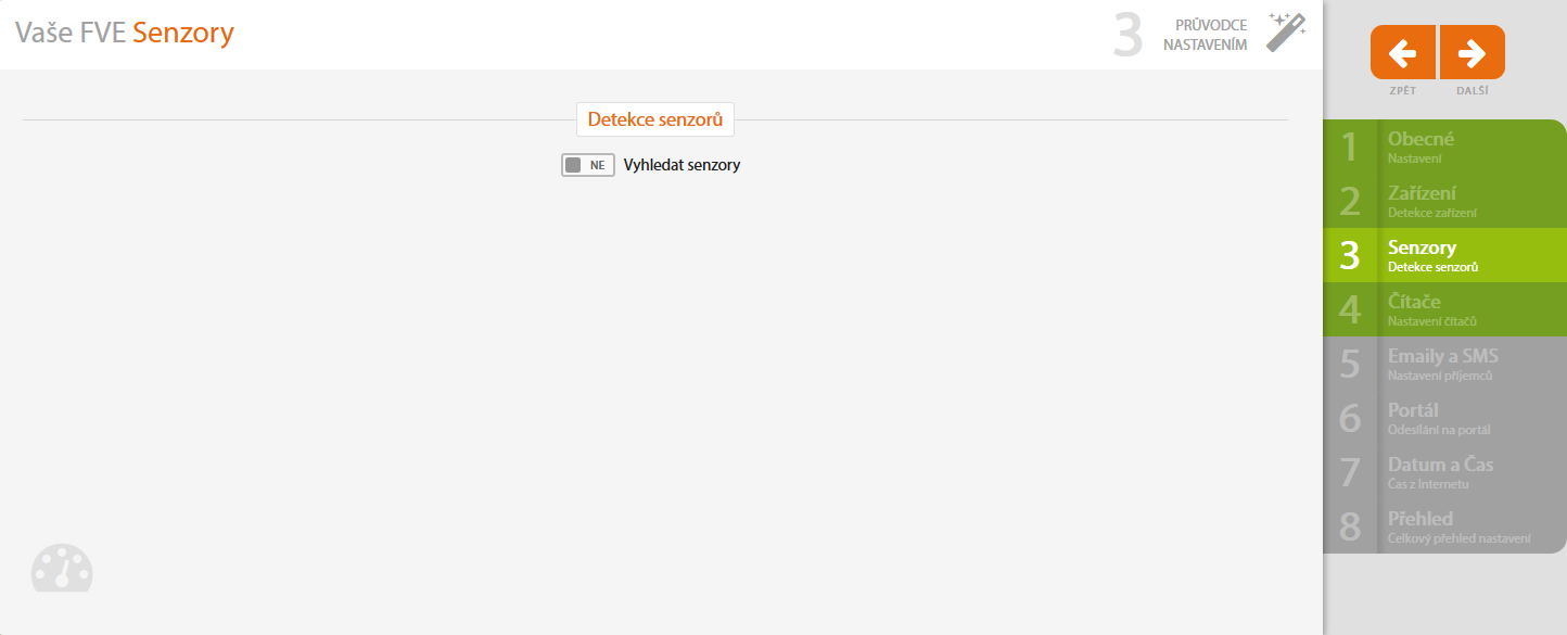 Pokud nemáte k jednotce Solar Monitor připojené žádné senzory, ponechte v políčku Vyhledat senzory volbu NE a klikněte vpravo na šipku Další.