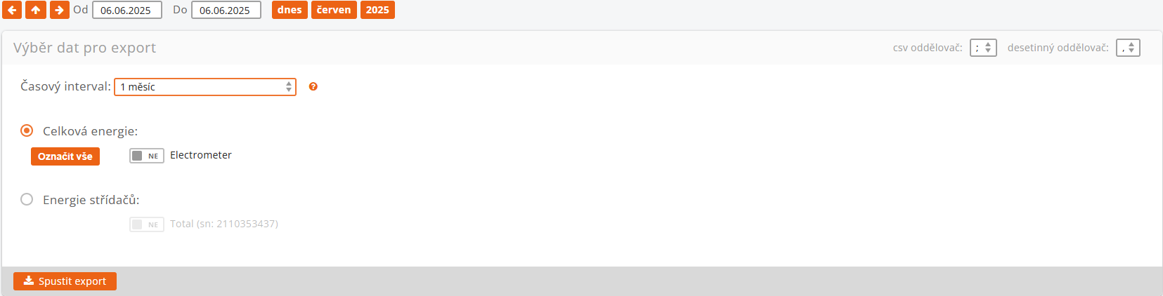 Vyberte jednotku (popř. jednotky) Solar Monitor pro export dat celkové vyrobené energie.