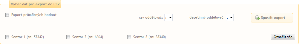Vyberte senzor (popř. senzory) pro export naměřených hodnot. V denním pohledu zobrazuje všechna přijatá data (dle nastaveného intervalu, min. 5 minut). Při intervalu větším než dva dny se data průměrují (pomocí aritmetického průměru) z příjatých dat za časový interval 60 minut. Pokud zobrazený interval přesáhne 30 dní, zobrazená data se průměrují (pomocí aritmetického průměru) z přijatých za časový interval 24 hodin.