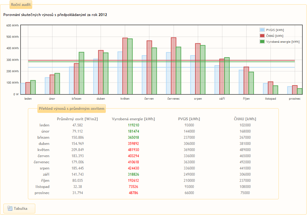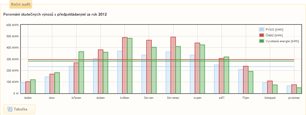 Slouží k porovnání skutečné výroby elektrárny s předpokládanou výrobou za vybraný rok. Podmínkou zobrazení dat je správné vyplnění údajů v podmenu Administrace/Data pro audit.