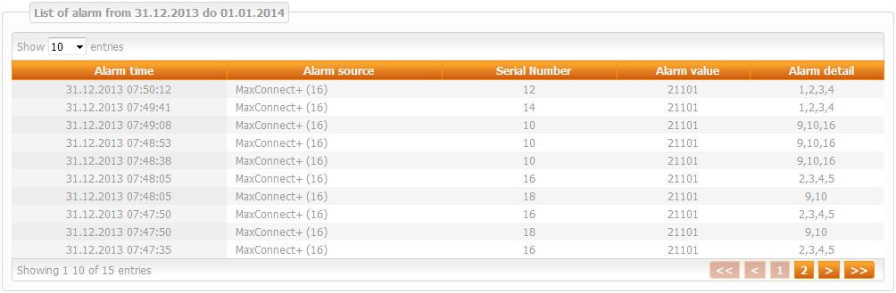 Recorded alarms can be presented for daily, monthly or annual period. Time period stipulates the day (days) of presented alarms.