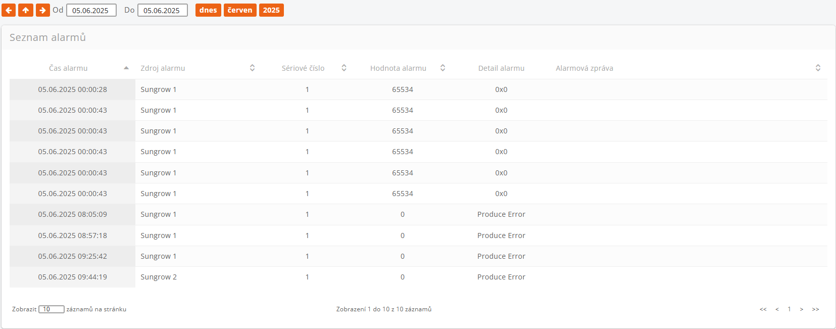 Error přečtený ve střídači, aktuální v čase vyhlášení alarmu (záleží na typu střídače, viz manuál ke střídači).