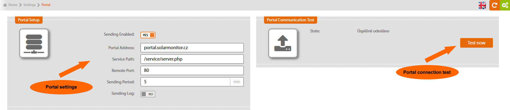 When you click on the button, a test message is sent to the portal and delivery status appears. Test packet does't contain inverters.
