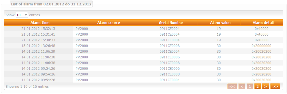 Recorded alarms can be presented for daily, monthly or annual period. Time period stipulates the day (days) of presented alarms.