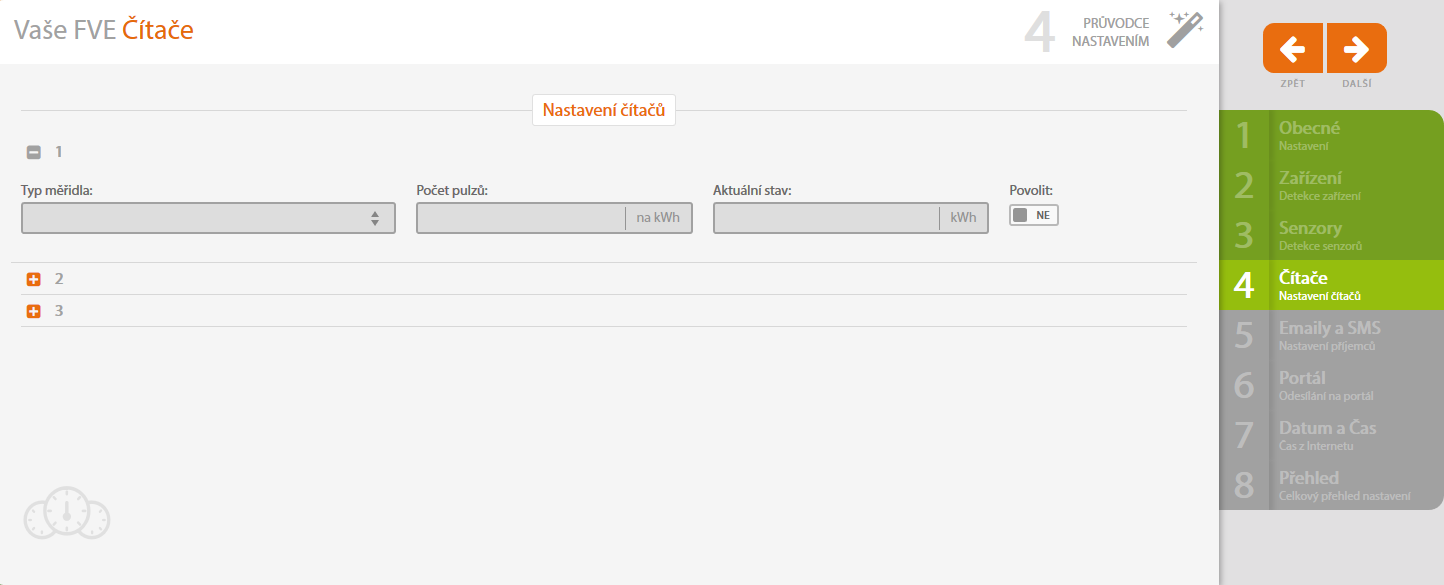 Pokud nemáte k Solar Monitoru připojený žádný čítač (elektroměr, plynoměr, vodoměr, střídač, tracker, baterii nebo jiné měřidlo), přejděte na Další >>