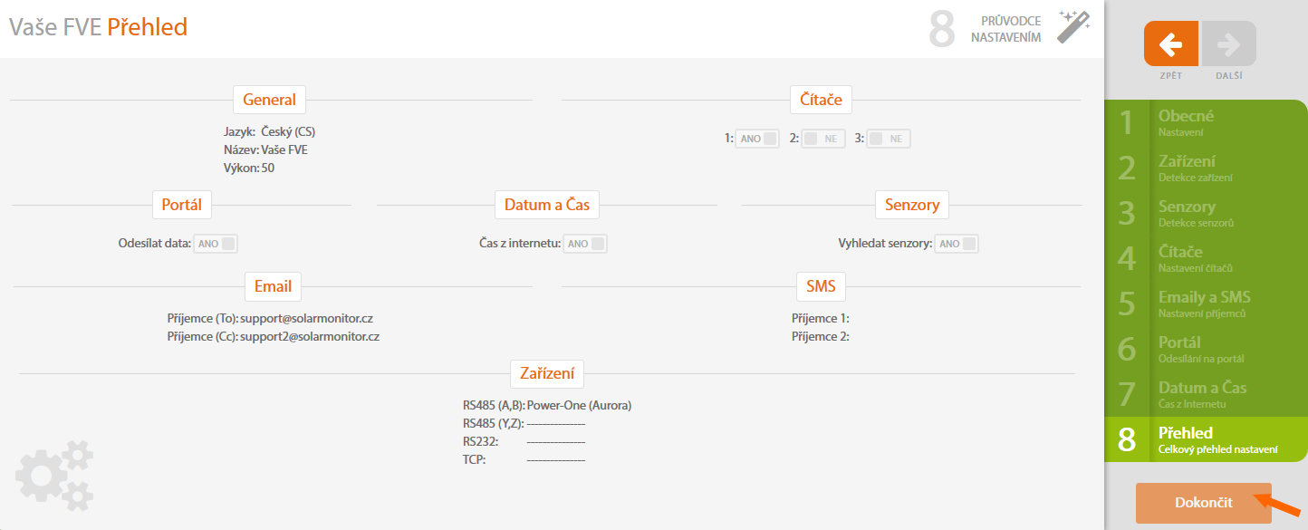Po kliknutí na tlačítko Dokončit vyčkejte než se provede konfigurace Solar Monitoru. Délka konfigurace závisí na tom, zda jsou detekována nějaká připojená zařízení (střídače, senzory, apod.).