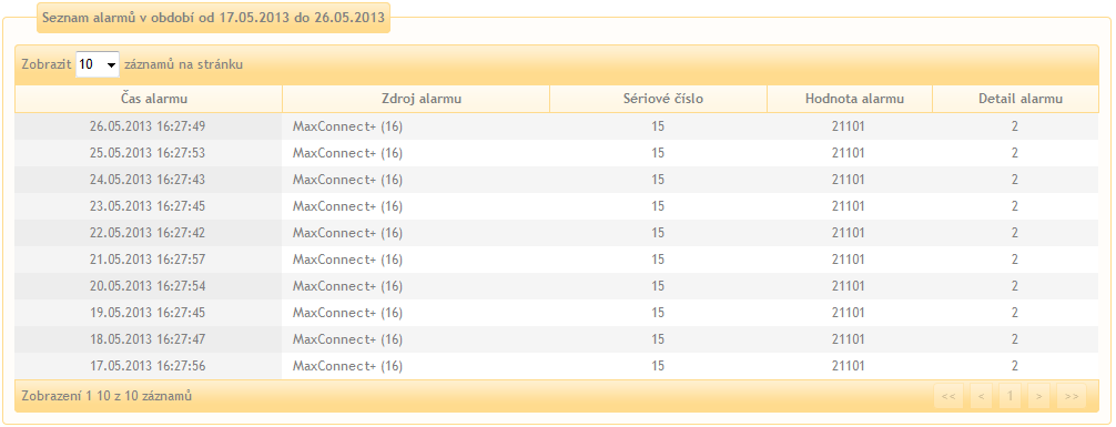Slouží k zobrazení záznamů alarmů stringboxů.